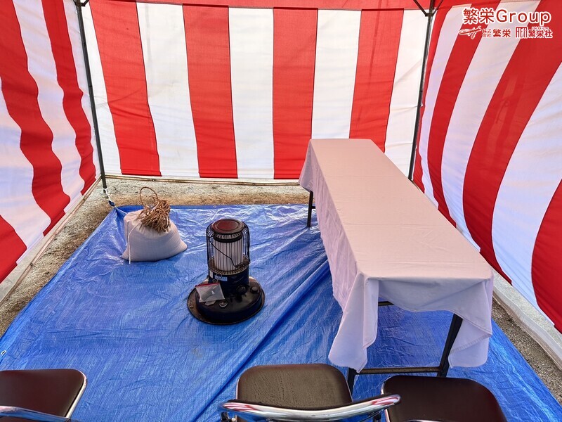 地鎮祭とは、建築工事や土木工事を行う前に、土地の神様を祀り、工事の安全や土地・ 建物の末永い安全を祈願する儀式です。 株式会社繁栄はテントレンタル・式典&地鎮祭レンタル・地鎮祭セット設営 地鎮祭テント・用品全般レンタル致します。