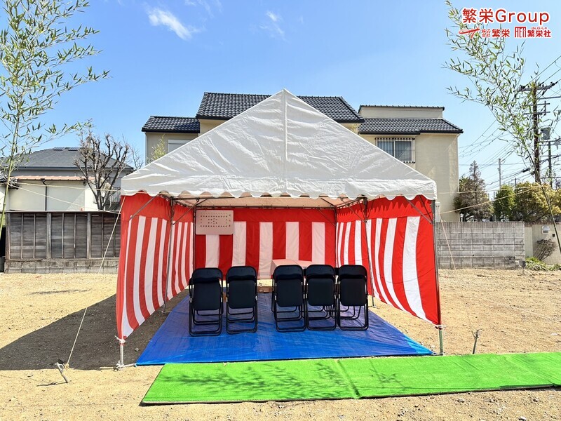 地鎮祭とは、建築工事や土木工事を行う前に、土地の神様を祀り、工事の安全や土地・ 建物の末永い安全を祈願する儀式です。 株式会社繁栄はテントレンタル・式典&地鎮祭レンタル・地鎮祭セット設営 地鎮祭テント・用品全般レンタル致します。