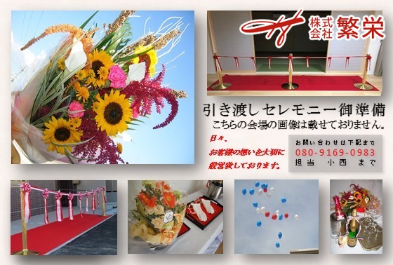 昭和より平成に変わる頃、地鎮祭・式典専門のテント屋さんとして大阪にて 営業を開始し30年近くが過ぎ、繁栄社の良きパートナー企業として 別会社を平成28年12月に新たに法人成り致しました。 株式会社繁栄 は設立2年目に入ったばかりの大阪府堺市にて地鎮祭など各種式典/企画 運営の会社です。大阪/兵庫/奈良/和歌山/近畿一円を中心にお客様第一をモットーに 親切・丁寧・24時間営業・年中無休にて営業しており可能な限り お客様目線 にて ご準備させて頂いております。業務内容につきましては地鎮祭・上棟式・竣工式等の 各種式典会場のテント設営を主としており、なかでも地鎮祭テントセット設営のAセット 人気のBセットなど、より解かりやすく必要な物をセットにし設営/撤去及び搬入/搬出の 全てをご提案させて頂いております。勿論、地鎮祭・上棟式・竣工式などの式典会場で ご使用の備品などのレンタル・リースもしております。 何なりとお申し付け下さい。 その他には竣工、引き渡しセレモニー時のテープカットやバルーンリリース、パンチ カーペット(赤/各種)などの装飾、現場見学会や内覧会などでご使用になるテント、 室内外の装飾なども準備しており、少しでもお手伝いが出来ればと思っております。 また、各種集会用テント・長方形テーブル・パイプイス・紅白幕などをご使用する 運動会・お祭り・町内会イベント・盆踊り・お花見・バーベキューなどの多種多様な お客様のご要望にお応え出来る様にスタッフ一同、日々努力・精進しております。 今後とも何卒、地鎮祭・上棟式・竣工式の施工・設営や地鎮祭テントの事なら 近畿一円対応の 株式会社繁栄 をよろしくお願い申し上げます。