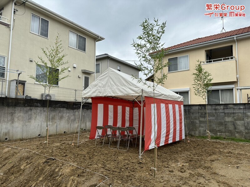 地鎮祭とは、建築工事や土木工事を行う前に、土地の神様を祀り、工事の安全や土地・ 建物の末永い安全を祈願する儀式です。 株式会社繁栄はテントレンタル・式典&地鎮祭レンタル・地鎮祭セット設営 地鎮祭テント・用品全般レンタル致します。