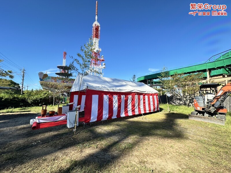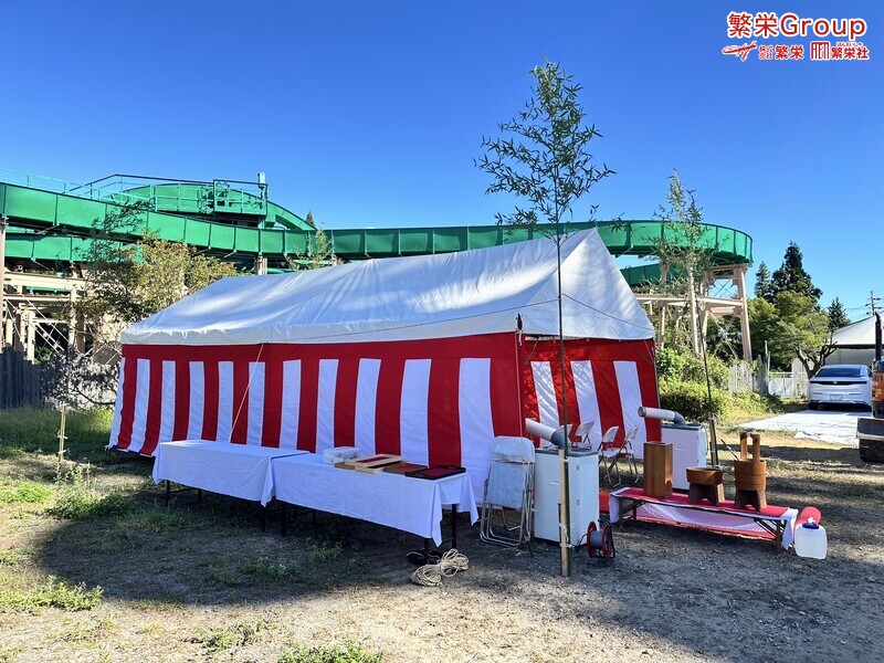 地鎮祭とは、建築工事や土木工事を行う前に、土地の神様を祀り、工事の安全や土地・ 建物の末永い安全を祈願する儀式です。 株式会社繁栄はテントレンタル・式典&地鎮祭レンタル・地鎮祭セット設営 地鎮祭テント・用品全般レンタル致します。