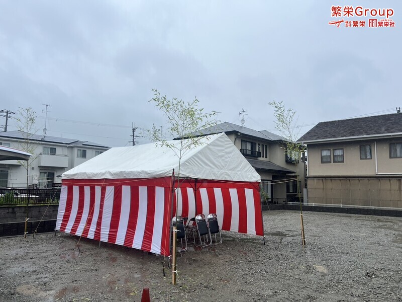 地鎮祭とは、建築工事や土木工事を行う前に、土地の神様を祀り、工事の安全や土地・ 建物の末永い安全を祈願する儀式です。 株式会社繁栄はテントレンタル・式典&地鎮祭レンタル・地鎮祭セット設営 地鎮祭テント・用品全般レンタル致します。