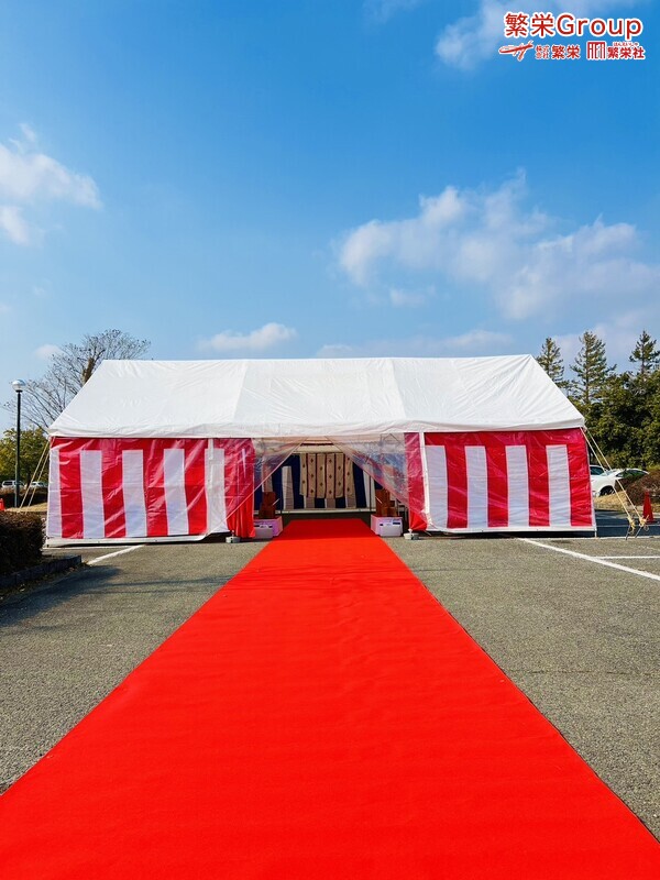 地鎮祭とは、建築工事や土木工事を行う前に、土地の神様を祀り、工事の安全や土地・ 建物の末永い安全を祈願する儀式です。 株式会社繁栄はテントレンタル・式典&地鎮祭レンタル・地鎮祭セット設営 地鎮祭テント・用品全般レンタル致します。