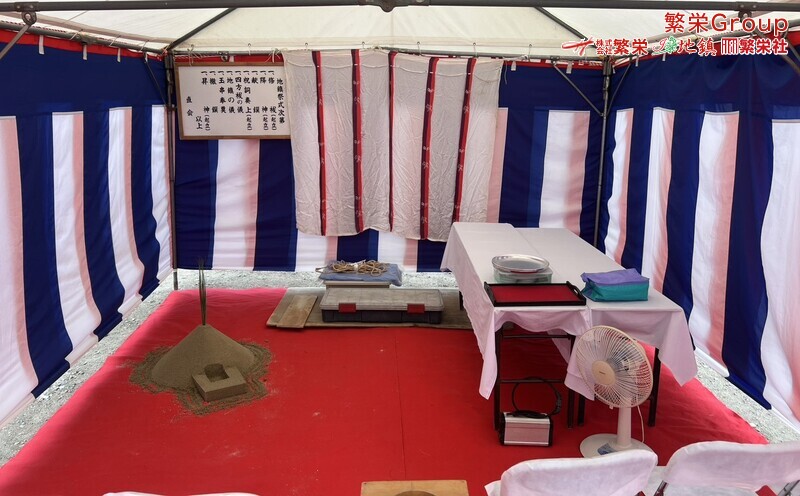 地鎮祭とは、建築工事や土木工事を行う前に、土地の神様を祀り、工事の安全や土地・ 建物の末永い安全を祈願する儀式です。 株式会社繁栄はテントレンタル・式典&地鎮祭レンタル・地鎮祭セット設営 地鎮祭テント・用品全般レンタル致します。