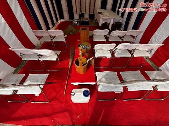 清竹4本/木杭4本/注連縄20m1本/清砂2斗/テント2間×3間/紅白幕2枚/長方形テーブル(白クロス付)2台/パイプイス12脚