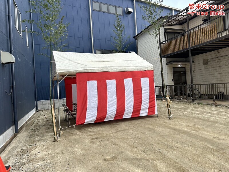 地鎮祭とは、建築工事や土木工事を行う前に、土地の神様を祀り、工事の安全や土地・ 建物の末永い安全を祈願する儀式です。 株式会社繁栄はテントレンタル・式典&地鎮祭レンタル・地鎮祭セット設営 地鎮祭テント・用品全般レンタル致します。