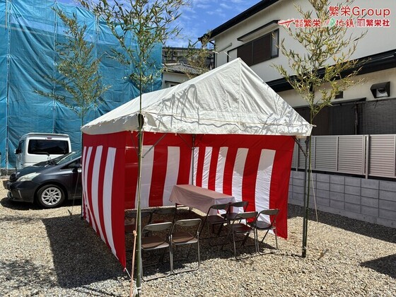 池田市にて住宅イベント 大阪で地鎮祭竹・テント設営準備業者なら繁栄まで 地鎮祭テント準備の事なら専門業者の株式会社繁栄までお申し付けください。近畿5営業所、全国