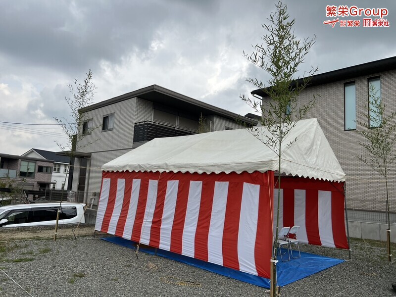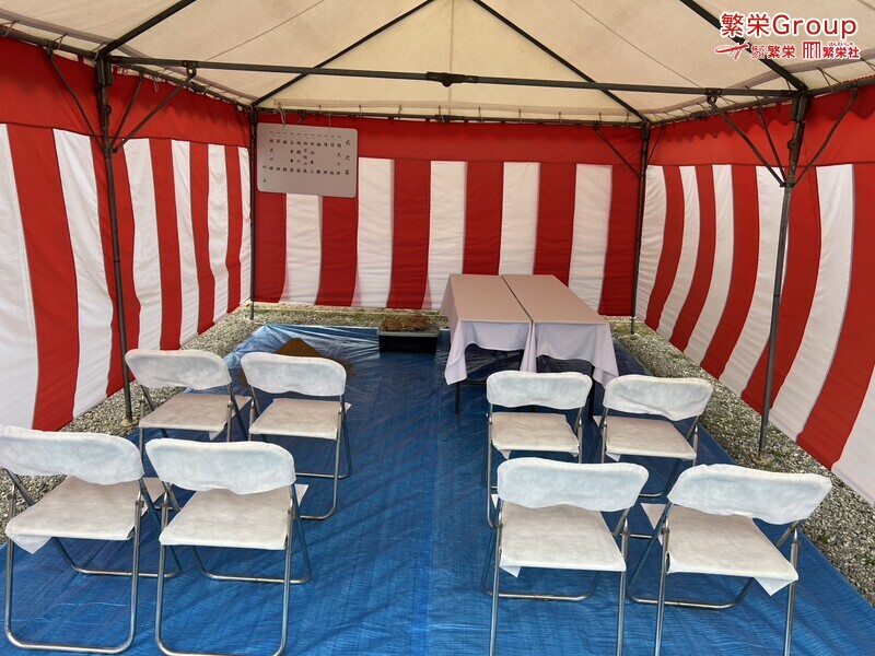 地鎮祭とは、建築工事や土木工事を行う前に、土地の神様を祀り、工事の安全や土地・ 建物の末永い安全を祈願する儀式です。 株式会社繁栄はテントレンタル・式典&地鎮祭レンタル・地鎮祭セット設営 地鎮祭テント・用品全般レンタル致します。
