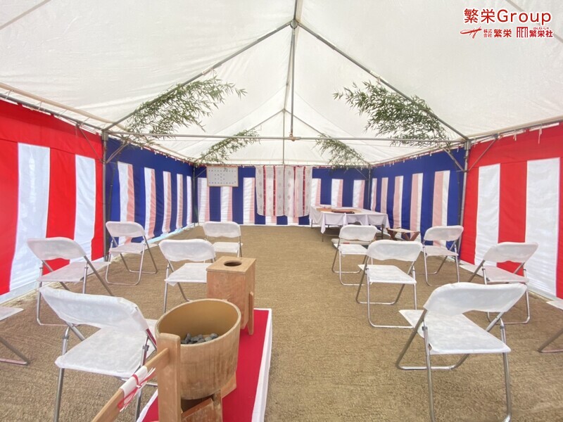 株式会社繁栄はテントレンタル・式典&地鎮祭レンタル・地鎮祭セット 引き渡しセレモニー・テープカット・バルーンリリースの準備にて 繁栄スタッフ一同、工事の安全と無事・令和の繁栄を祈願致します。。 感謝 |