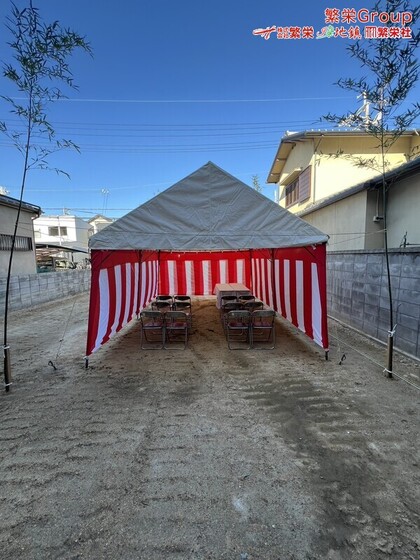 岸和田市で地鎮祭テント設営・準備の事なら株式会社繁栄までお申し付けください。 日本全国、地鎮祭テントレンタル全般は株式会社繁栄(地鎮祭専門店地鎮)まで・・ イベ