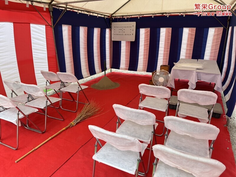 地鎮祭とは、建築工事や土木工事を行う前に、土地の神様を祀り、工事の安全や土地・ 建物の末永い安全を祈願する儀式です。 株式会社繁栄はテントレンタル・式典&地鎮祭レンタル・地鎮祭セット設営 地鎮祭テント・用品全般レンタル致します。