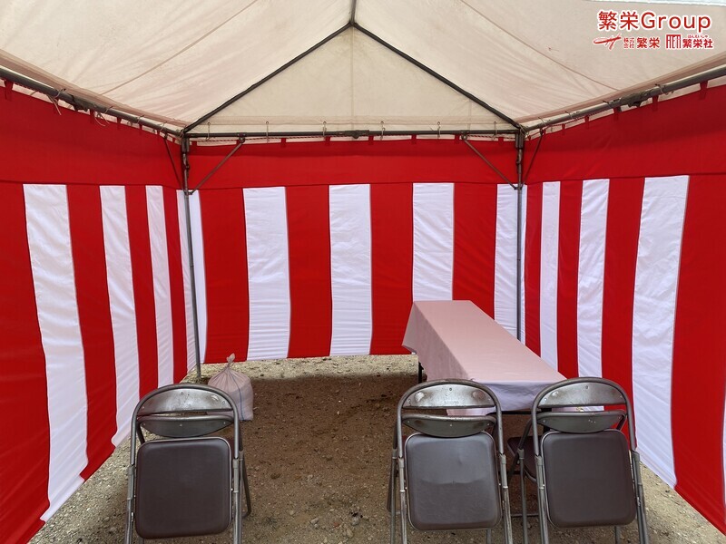 地鎮祭とは、建築工事や土木工事を行う前に、土地の神様を祀り、工事の安全や土地・ 建物の末永い安全を祈願する儀式です。 株式会社繁栄はテントレンタル・式典&地鎮祭レンタル・地鎮祭セット設営 地鎮祭テント・用品全般レンタル致します。