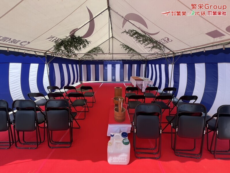 地鎮祭とは、建築工事や土木工事を行う前に、土地の神様を祀り、工事の安全や土地・ 建物の末永い安全を祈願する儀式です。 株式会社繁栄はテントレンタル・式典&地鎮祭レンタル・地鎮祭セット設営 地鎮祭テント・用品全般レンタル致します。
