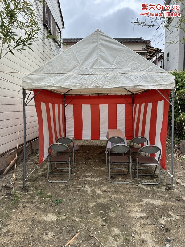 地鎮祭とは、建築工事や土木工事を行う前に、土地の神様を祀り、工事の安全や土地・ 建物の末永い安全を祈願する儀式です。 株式会社繁栄はテントレンタル・式典&地鎮祭レンタル・地鎮祭セット設営 地鎮祭テント・用品全般レンタル致します。