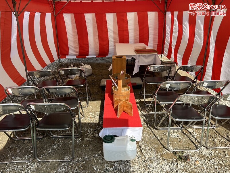 地鎮祭とは、建築工事や土木工事を行う前に、土地の神様を祀り、工事の安全や土地・ 建物の末永い安全を祈願する儀式です。 株式会社繁栄はテントレンタル・式典&地鎮祭レンタル・地鎮祭セット設営 地鎮祭テント・用品全般レンタル致します。