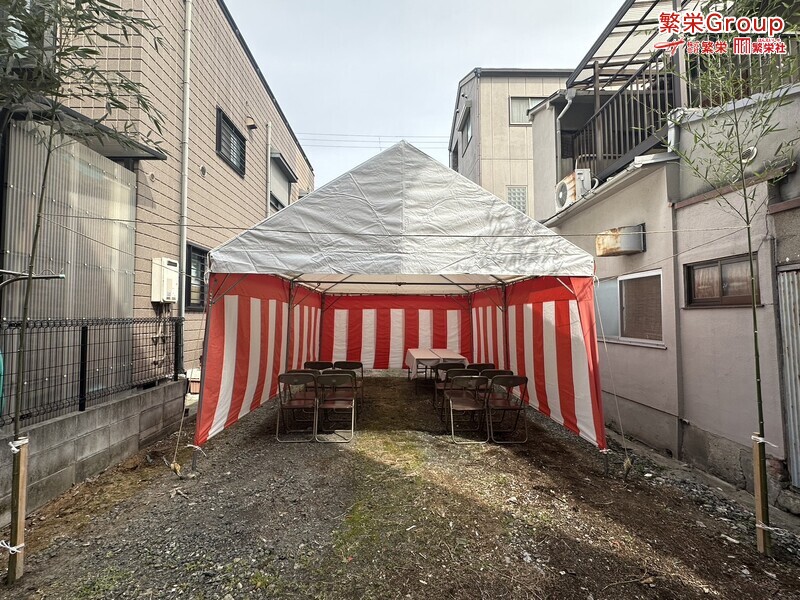地鎮祭とは、建築工事や土木工事を行う前に、土地の神様を祀り、工事の安全や土地・ 建物の末永い安全を祈願する儀式です。 株式会社繁栄はテントレンタル・式典&地鎮祭レンタル・地鎮祭セット設営 地鎮祭テント・用品全般レンタル致します。