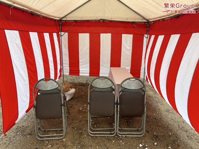 地鎮祭とは、建築工事や土木工事を行う前に、土地の神様を祀り、工事の安全や土地・ 建物の末永い安全を祈願する儀式です。 株式会社繁栄はテントレンタル・式典&地鎮祭レンタル・地鎮祭セット設営 地鎮祭テント・用品全般レンタル致します。