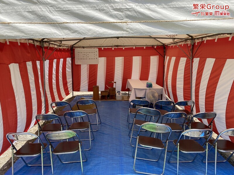 地鎮祭とは、建築工事や土木工事を行う前に、土地の神様を祀り、工事の安全や土地・ 建物の末永い安全を祈願する儀式です。 株式会社繁栄はテントレンタル・式典&地鎮祭レンタル・地鎮祭セット設営 地鎮祭テント・用品全般レンタル致します。