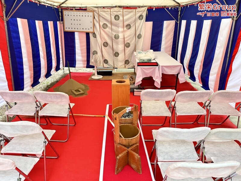 地鎮祭とは、建築工事や土木工事を行う前に、土地の神様を祀り、工事の安全や土地・ 建物の末永い安全を祈願する儀式です。 株式会社繁栄はテントレンタル・式典&地鎮祭レンタル・地鎮祭セット設営 地鎮祭テント・用品全般レンタル致します。