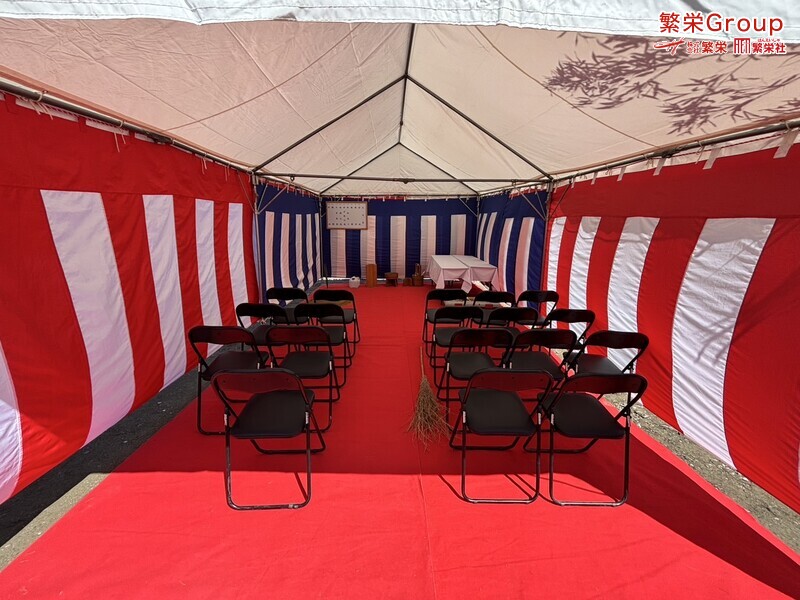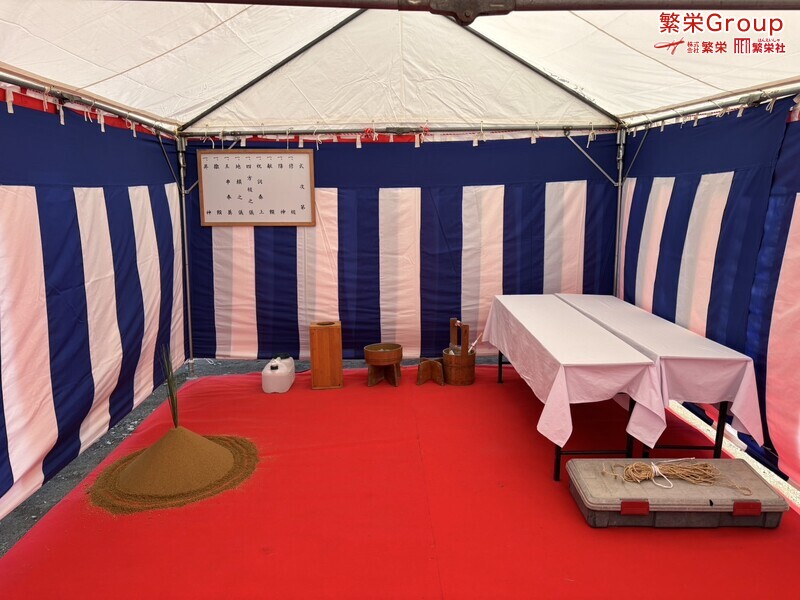 地鎮祭とは、建築工事や土木工事を行う前に、土地の神様を祀り、工事の安全や土地・ 建物の末永い安全を祈願する儀式です。 株式会社繁栄はテントレンタル・式典&地鎮祭レンタル・地鎮祭セット設営 地鎮祭テント・用品全般レンタル致します。