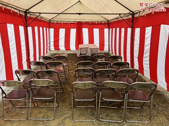 清竹4本/木杭4本/注連縄20m1本/清砂2斗/テント2間×3間/紅白幕2枚/長方形テーブル(白クロス付)2台/パイプイス12脚
