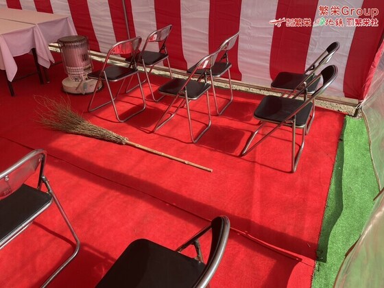 清竹4本/木杭4本/注連縄20m1本/清砂2斗/テント2間×3間/紅白幕2枚/長方形テーブル(白クロス付)2台/パイプイス12脚