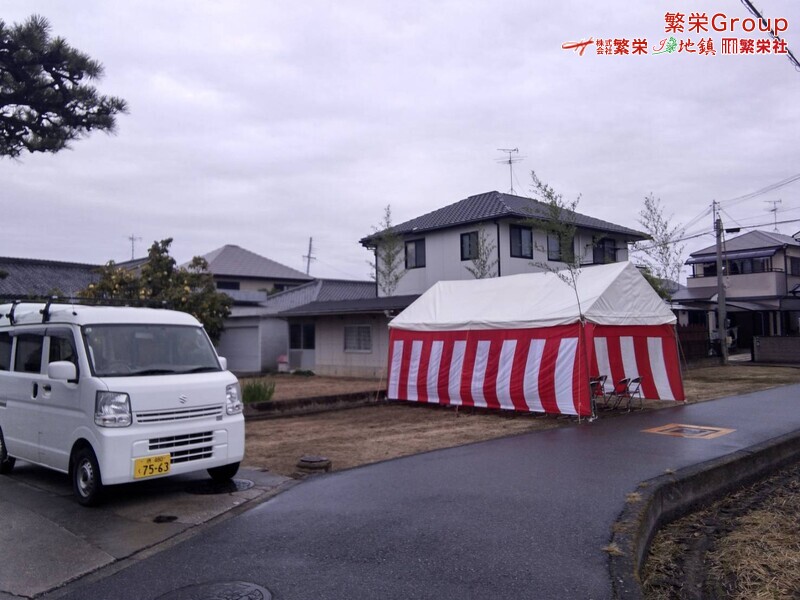 地鎮祭とは、建築工事や土木工事を行う前に、土地の神様を祀り、工事の安全や土地・ 建物の末永い安全を祈願する儀式です。 株式会社繁栄はテントレンタル・式典&地鎮祭レンタル・地鎮祭セット設営 地鎮祭テント・用品全般レンタル致します。