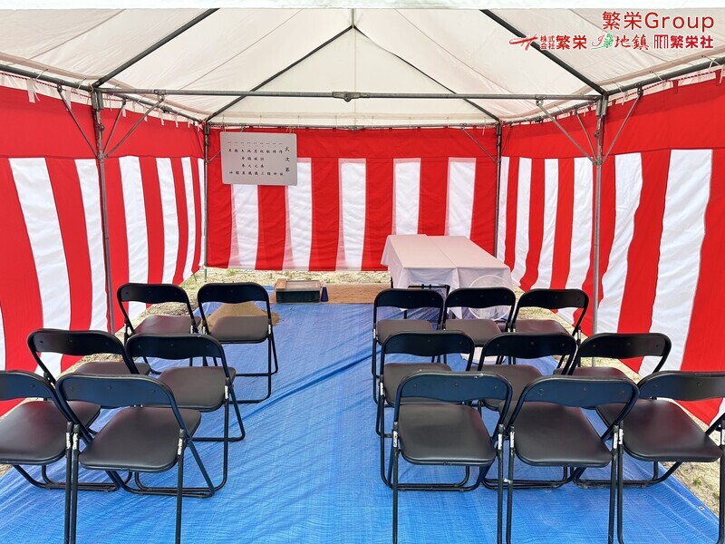 地鎮祭とは、建築工事や土木工事を行う前に、土地の神様を祀り、工事の安全や土地・ 建物の末永い安全を祈願する儀式です。 株式会社繁栄はテントレンタル・式典&地鎮祭レンタル・地鎮祭セット設営 地鎮祭テント・用品全般レンタル致します。
