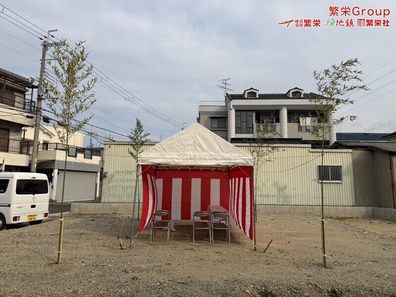 地鎮祭とは、建物の新築や土木工事の起工の際などにその土地の神様を祀り工事の無事進行・完了と土地・建造物が末長く安全堅固であることを繁栄祈願するためにおこなわれる祭りで、国土の守護神である大地主神(おおとこぬしのかみ)と、その地域の神様である産土神(うぶすなのかみ)、その土地の神々である「此の地を宇志波伎坐大神(うしはきますおおかみ)等」をお祀りします。