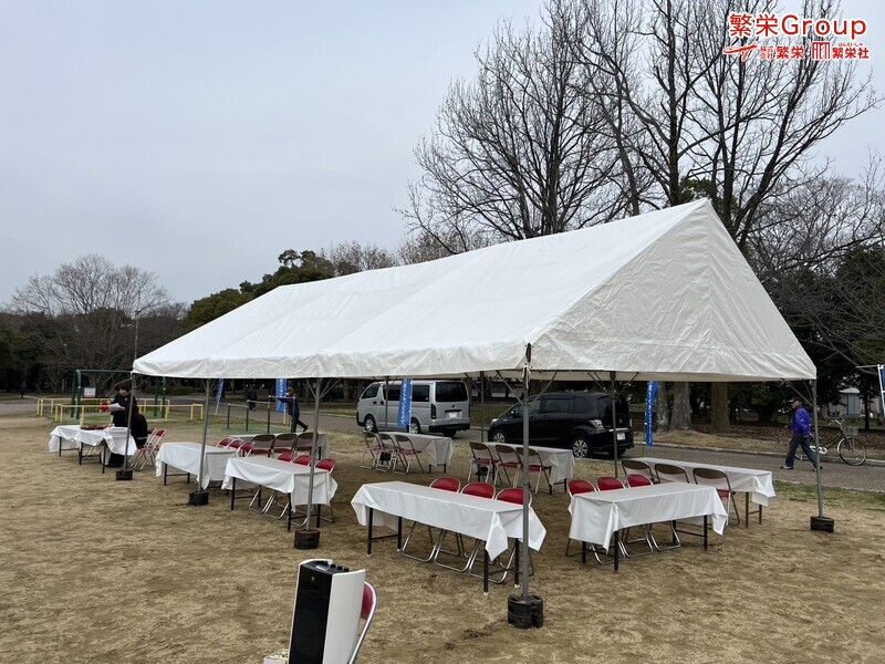 地鎮祭とは、建築工事や土木工事を行う前に、土地の神様を祀り、工事の安全や土地・ 建物の末永い安全を祈願する儀式です。 株式会社繁栄はテントレンタル・式典&地鎮祭レンタル・地鎮祭セット設営 地鎮祭テント・用品全般レンタル致します。