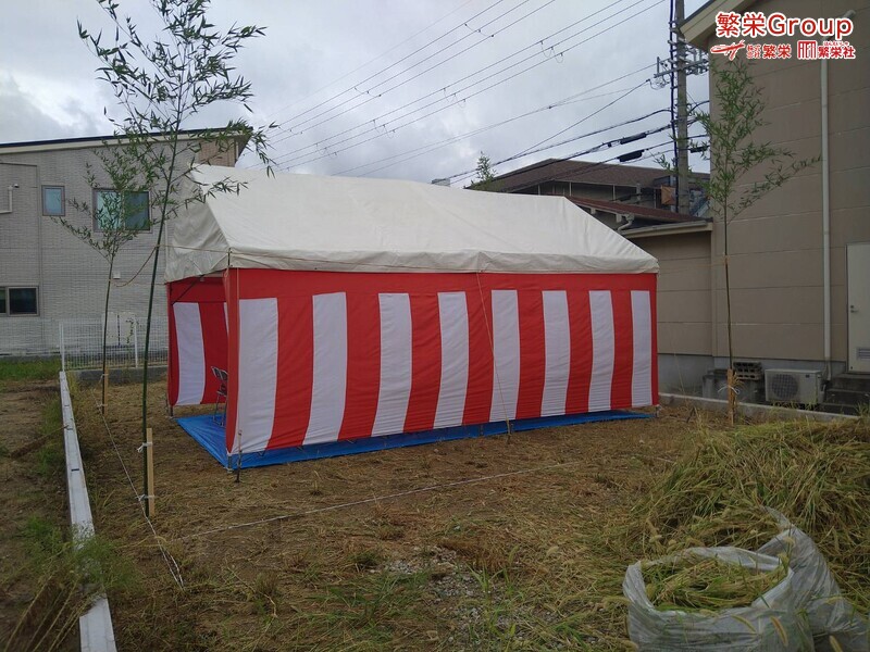 地鎮祭とは、建築工事や土木工事を行う前に、土地の神様を祀り、工事の安全や土地・ 建物の末永い安全を祈願する儀式です。 株式会社繁栄はテントレンタル・式典&地鎮祭レンタル・地鎮祭セット設営 地鎮祭テント・用品全般レンタル致します。