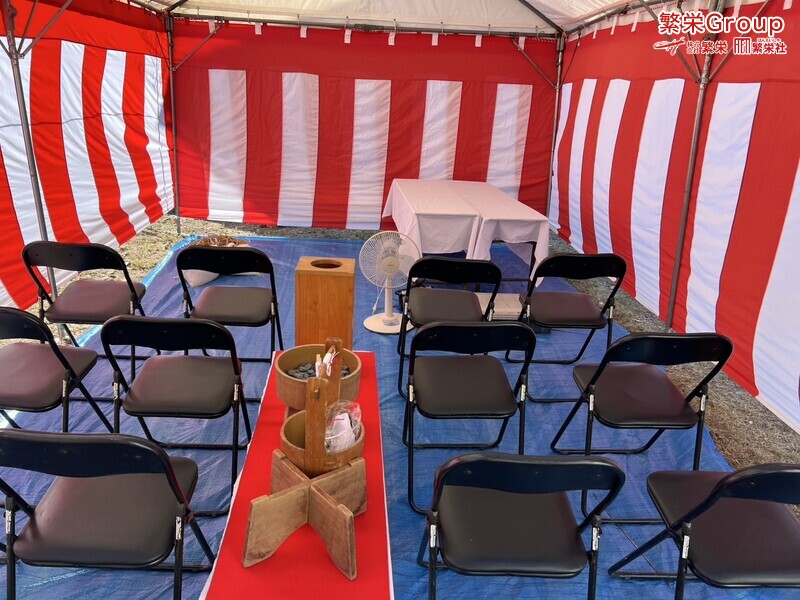 地鎮祭とは、建築工事や土木工事を行う前に、土地の神様を祀り、工事の安全や土地・ 建物の末永い安全を祈願する儀式です。 株式会社繁栄はテントレンタル・式典&地鎮祭レンタル・地鎮祭セット設営 地鎮祭テント・用品全般レンタル致します。