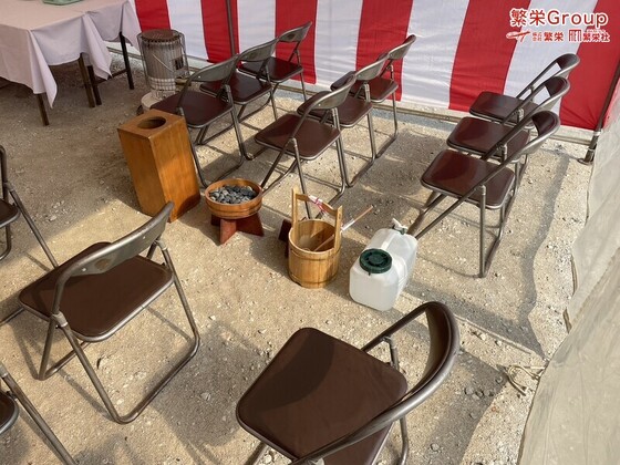 清竹4本/木杭4本/注連縄20m1本/清砂2斗/テント2間×3間/紅白幕2枚/長方形テーブル(白クロス付)2台/パイプイス12脚