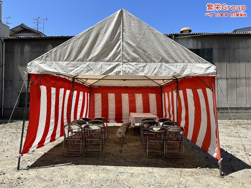 地鎮祭とは、建築工事や土木工事を行う前に、土地の神様を祀り、工事の安全や土地・ 建物の末永い安全を祈願する儀式です。 株式会社繁栄はテントレンタル・式典&地鎮祭レンタル・地鎮祭セット設営 地鎮祭テント・用品全般レンタル致します。