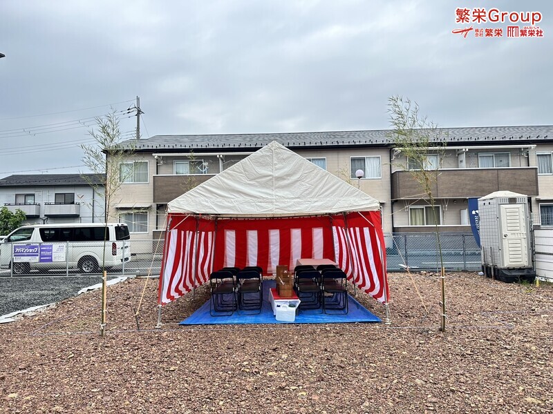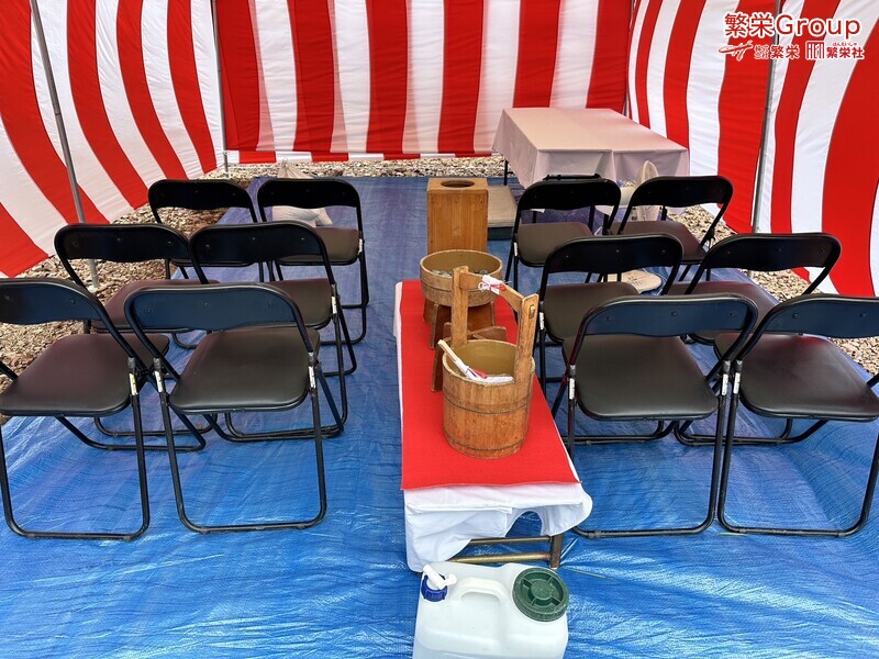 地鎮祭とは、建築工事や土木工事を行う前に、土地の神様を祀り、工事の安全や土地・ 建物の末永い安全を祈願する儀式です。 株式会社繁栄はテントレンタル・式典&地鎮祭レンタル・地鎮祭セット設営 地鎮祭テント・用品全般レンタル致します。