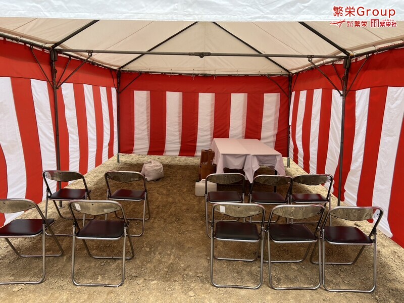 地鎮祭とは、建築工事や土木工事を行う前に、土地の神様を祀り、工事の安全や土地・ 建物の末永い安全を祈願する儀式です。 株式会社繁栄はテントレンタル・式典&地鎮祭レンタル・地鎮祭セット設営 地鎮祭テント・用品全般レンタル致します。