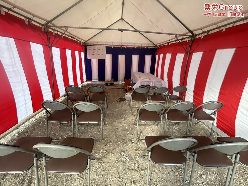 地鎮祭とは、建築工事や土木工事を行う前に、土地の神様を祀り、工事の安全や土地・ 建物の末永い安全を祈願する儀式です。 株式会社繁栄はテントレンタル・式典&地鎮祭レンタル・地鎮祭セット設営 地鎮祭テント・用品全般レンタル致します。