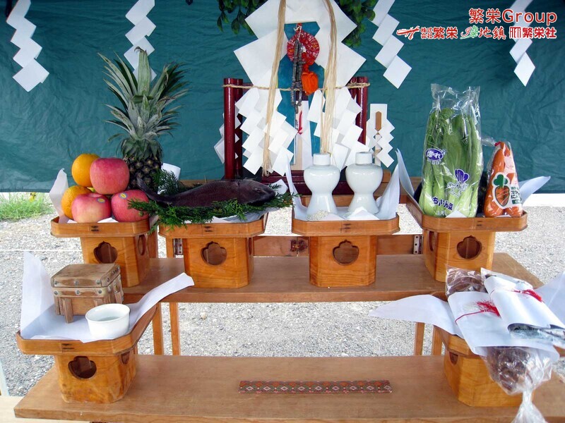 地鎮祭とは、建築工事や土木工事を行う前に、土地の神様を祀り、工事の安全や土地・ 建物の末永い安全を祈願する儀式です。 株式会社繁栄はテントレンタル・式典&地鎮祭レンタル・地鎮祭セット設営 地鎮祭テント・用品全般レンタル致します。