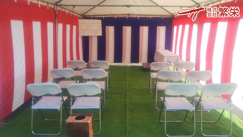 紅白幕レンタル・スタッキングチェア・テーブルレンタルなら繁栄へ 大阪・神戸・奈良・近畿・東京で引き渡しセレモニーなら大阪の繁栄まで 地鎮祭テント 上棟式(御幣製作/準備) 竣工式 起工式なら繁栄へ 記念祝賀会・落成披露パーティーなどの会場設営の事なら 繁栄 まで 夏の地鎮祭、式典会場設営なら 神戸ポート(営)・奈良ポート(営)へ・・・ 地震・災害に強い、永く住める建物を地鎮祭にて祈願 お手伝い致します。