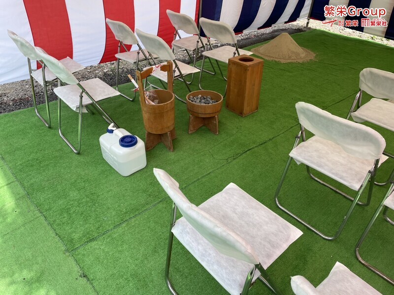 地鎮祭とは、建築工事や土木工事を行う前に、土地の神様を祀り、工事の安全や土地・ 建物の末永い安全を祈願する儀式です。 株式会社繁栄はテントレンタル・式典&地鎮祭レンタル・地鎮祭セット設営 地鎮祭テント・用品全般レンタル致します。