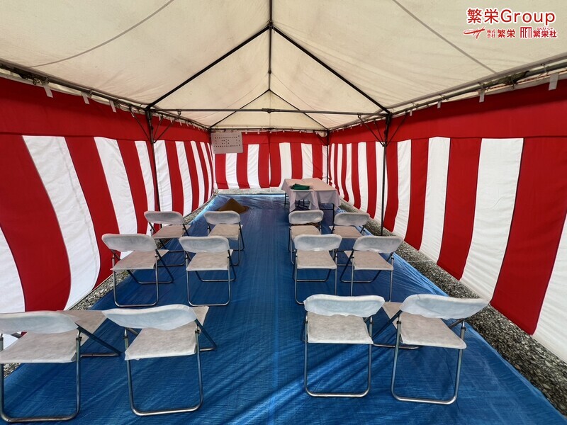 地鎮祭とは、建築工事や土木工事を行う前に、土地の神様を祀り、工事の安全や土地・ 建物の末永い安全を祈願する儀式です。 株式会社繁栄はテントレンタル・式典&地鎮祭レンタル・地鎮祭セット設営 地鎮祭テント・用品全般レンタル致します。