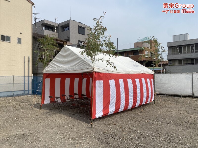 地鎮祭とは、建築工事や土木工事を行う前に、土地の神様を祀り、工事の安全や土地・ 建物の末永い安全を祈願する儀式です。 株式会社繁栄はテントレンタル・式典&地鎮祭レンタル・地鎮祭セット設営 地鎮祭テント・用品全般レンタル致します。